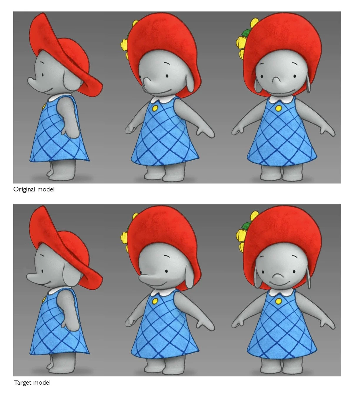 3D turnaround feedback. Subtle changes to the placement of facial features brought the character design closer to the tone of the books. I carefully edited their turnaround to better reflect the proportions of the original book illustrations, giving Ella a much higher “cute quotient”.